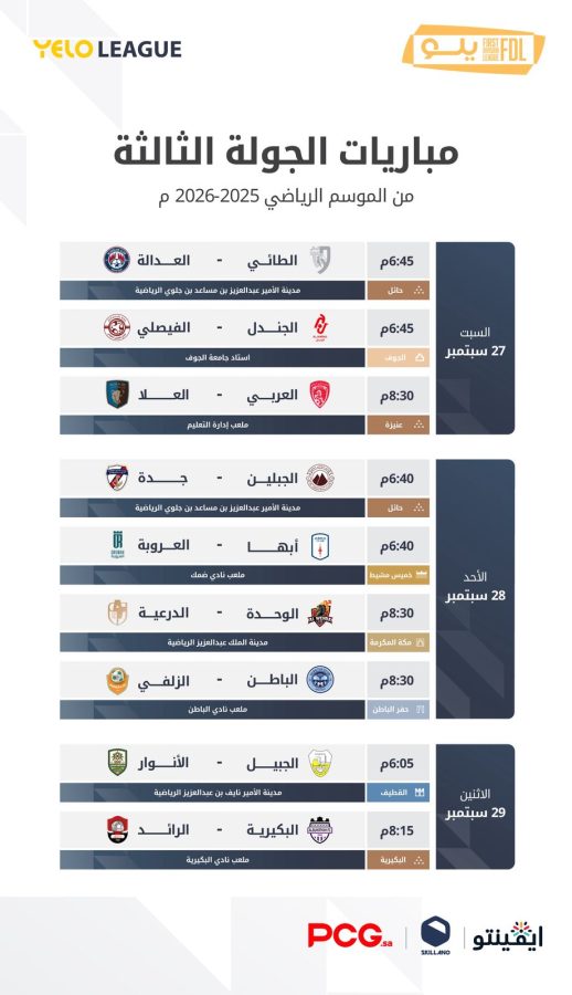 وتختتم الاثنين منافسات الجولة الثالثة بإقامة مباراتين حيث يستقبل الجبيل ضيفه الأنوار، فيما تتجه الأنظار لديربي القصيم بين البكيرية والرائد.